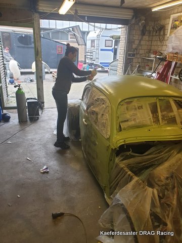 der Käfer wird nun noch mal richtig sauber gemacht und dabei bekommt er einen neuen Anstrich 🙂 …. Richtig lackieren kann JEDER …. wir nehmen die alt bewährte Desaster Methode …. DOSE statt Pistole 😉 … also dann mal drauf mit dem Lack …