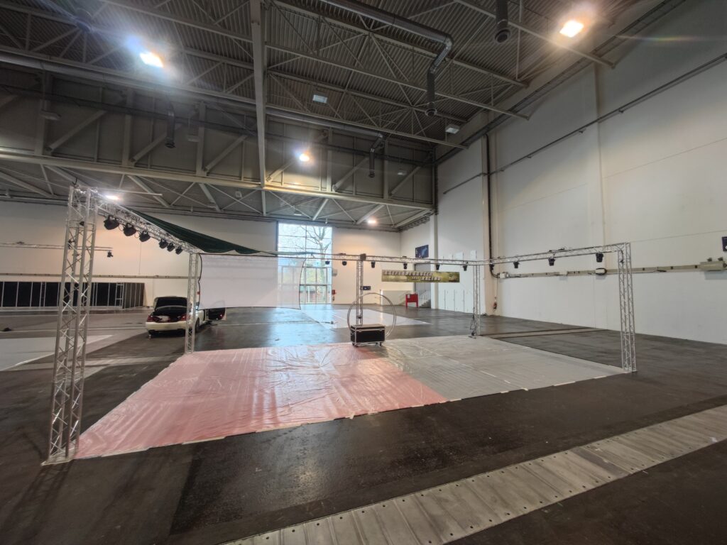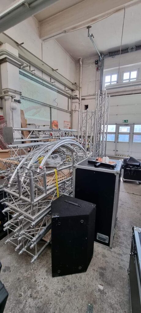 Die Traversen hängen bzw. stehen und die Lampen haben ihren Platz gefunden.