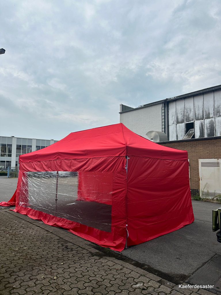 Eine Seite mit Fenster der Rest zu. Damit ist nun endlich die Zeit vorbei, in der wir draußen im Regen gestanden haben und alles nass wurde, während bei den anderen Teams alles schön trocken war. Jetzt kann auch unsere Heizung zum Einsatz kommen.